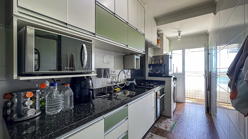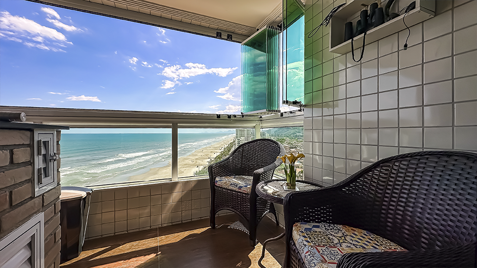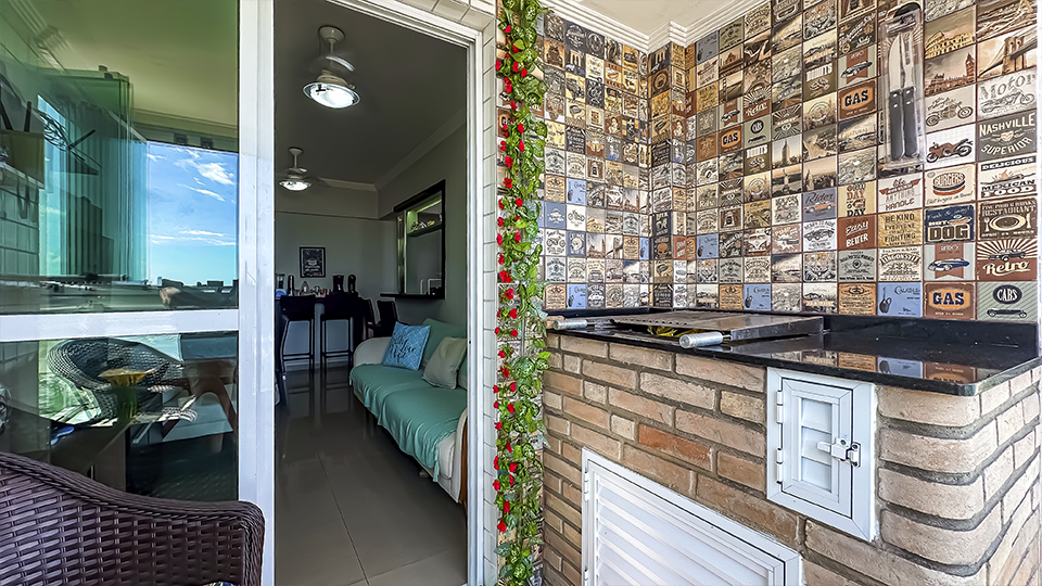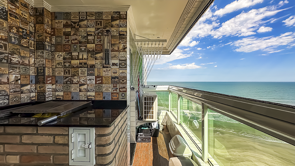O grande destaque é, sem dúvida, a sacada gourmet. Equipada com churrasqueira e fechamento em vidro, ela oferece uma vista definitiva para o mar. É o espaço perfeito para momentos inesquecíveis com amigos e família, tendo o oceano como cenário principal.